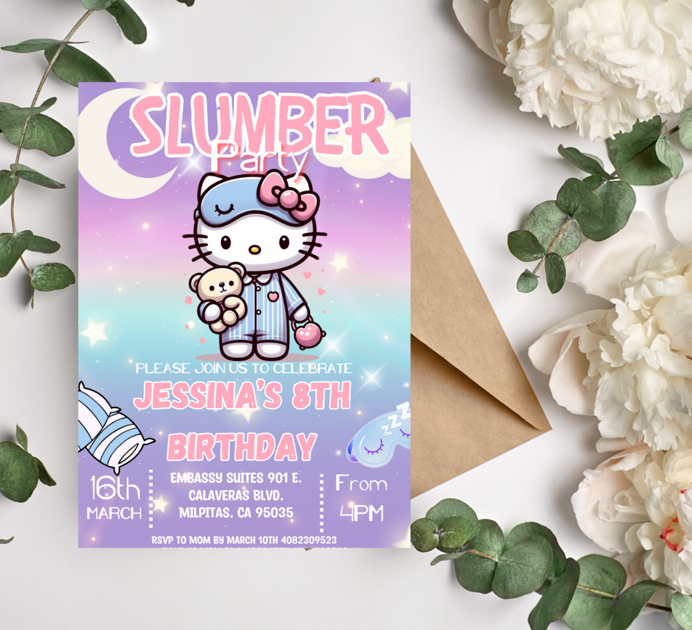 Get ready for a night of fun and friendship with this Hello Kitty Purple Gradient Slumber Party Birthday Invitation! Featuring a beautiful purple gradient background and adorable Hello Kitty design, this invite is perfect for a sleepover-themed birthday celebration. Customizable and ideal for kids who love Hello Kitty, slumber parties, and all things cute. Set the tone for a cozy and unforgettable birthday bash!